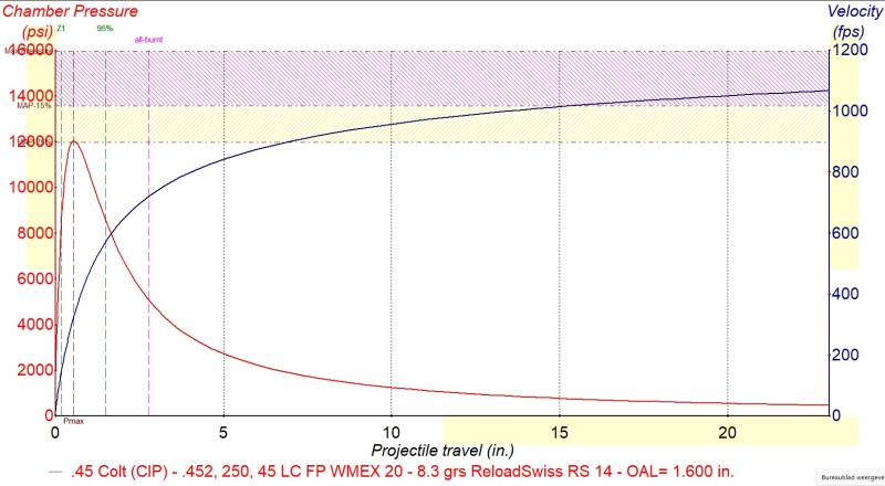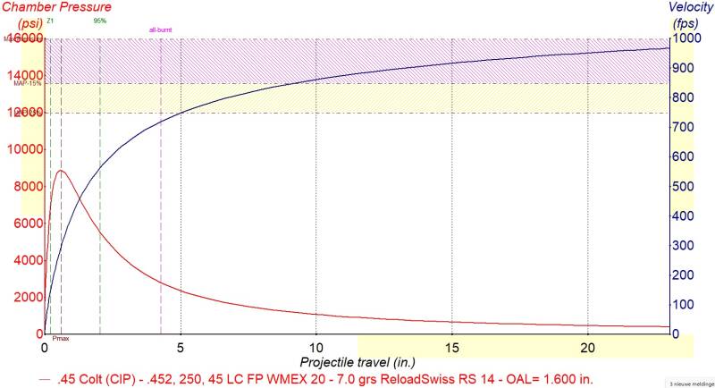 De druk is ruim beneden de kritische maximale druk (gearceerde lijn), dus zeer veilig. Het is een rustige lading en uitermate geschikt voor de schietsport en cowboy action shooting.