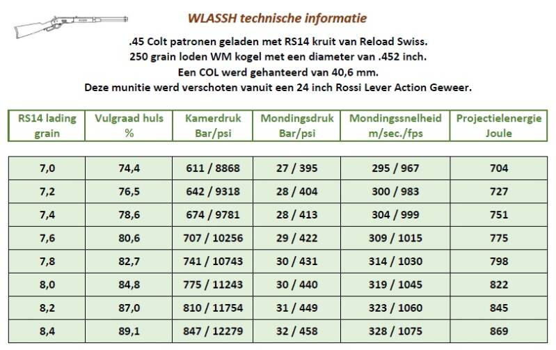 Duidelijk is te zien hoe dit kruit reageert bij verhoging van de lading. De mondingsdruk blijft behoorlijk stabiel dus ook de snelheid van het projectiel. De lading verhogen is enkel nuttig om te zien hoe het afkomt op de kaart vanuit uw wapen. Of de schutter moet andere doelen met het wapen hebben, bijvoorbeeld houtblok schieten. dan is de energie natuurlijk wel een punt om in de gaten te houden. Maar hadden we daar een voorbeeld van gemaakt dan zouden we een heel ander kruit hebben ingezet. Aangezien de WLASSH aan echte vorm van schijfschieten doet, is de rustige RS14 lading gewoon een aanrader.