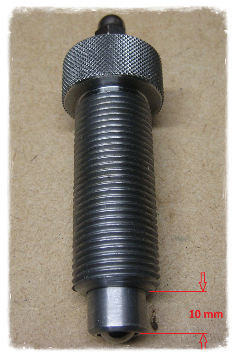 Met afstellen bedoelen we dat de plunjer met stalen bol aan de onderzijde exact 10 mm uit moet steken t.o.v. de houder.
