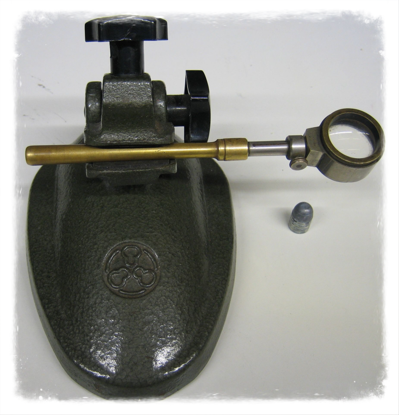 Twee attributen die we nodig hebben om de indrukking van de hardstalen bol te kunnen meten. Links de digitale schuifmaat welke in zowel inch als mm kan aangeven. Een must voor de herlader en geschikt voor vele toepassingen aangaande kogels. rechts een houder met daarin geklemd een sterk vergrootglas. Deze maakt het zicht op de indrukking helder en meten gemakkelijker. Een steuntje is handig, je hebt immers beide handen nodig om dit te doen.