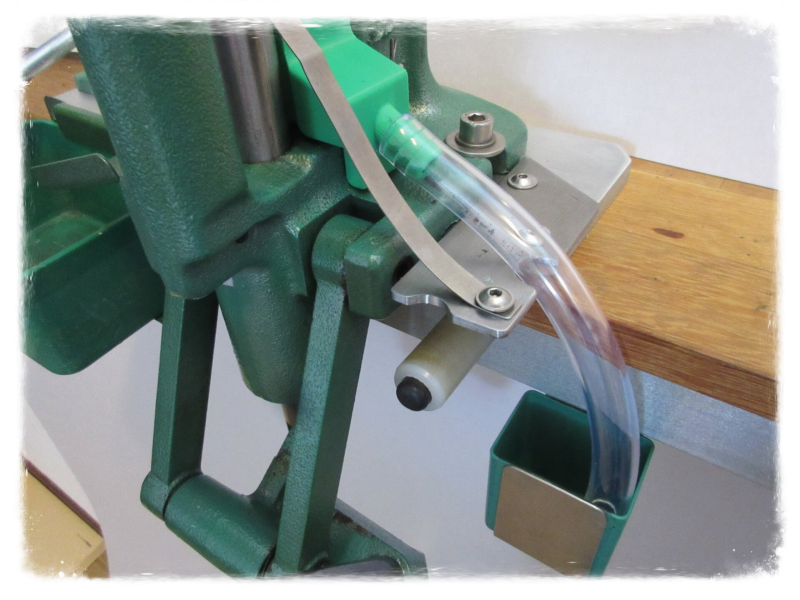 De hulzen worden door de klassieke RCBS ejector keurig in het bakje gedeponeerd na terugbrengen van de hevel. De oude slaghoedjes verdwijnen via de slang in het bakje en de pers is weer een stukje beter geworden.