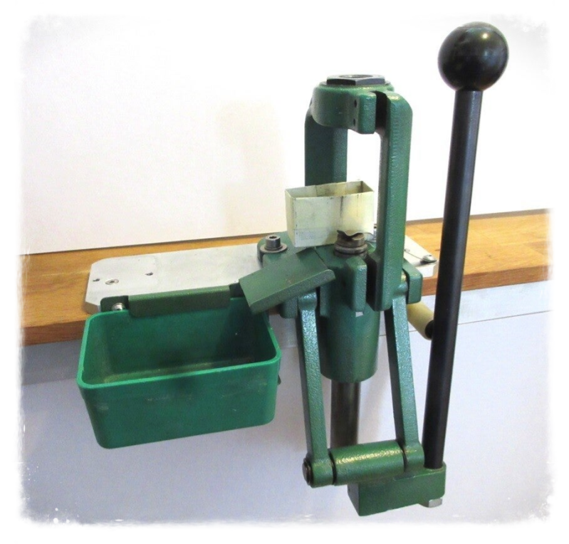 Een eerste model Rock Chucker met het bekende opvangbakje en aan de bovenzijde geklemd de houder voor de primer tube.