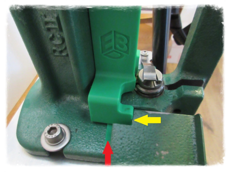 Op de foto met de pijlen is ook te zien dat het plateau van de hulzenbak niet meer gemonteerd kon worden zonder kleine aanpassing. Er is een hoekje uit het metaal weggenomen (zie gele pijl) omdat de linker voet van de primer catcher in de weg zat. Dat wegnemen gaf geen enkel probleem, de hulzen worden door de ejector keurig via het plateau in de bak gestoten. Maar toch moest dit even gebeuren maar het stond nergens vermeld.
