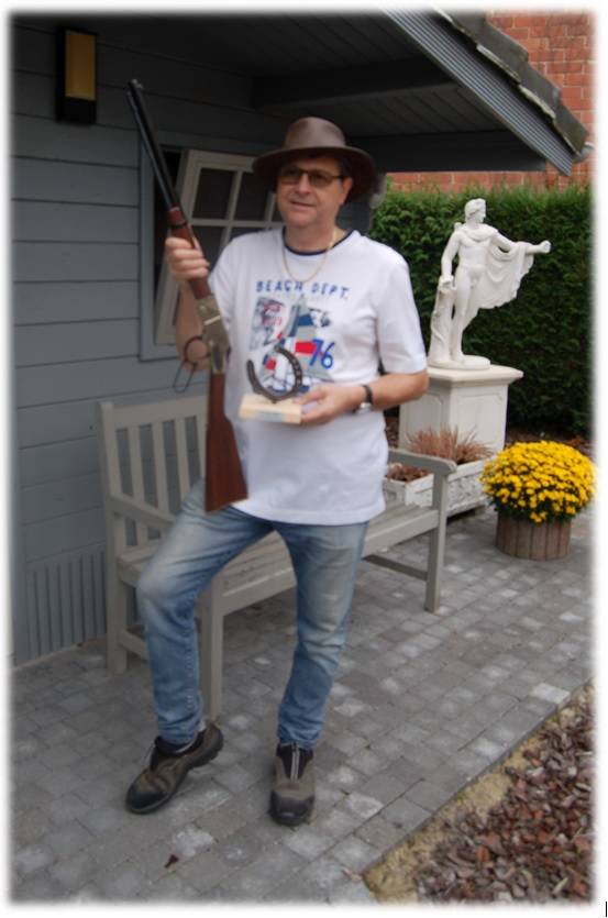 Sandro is een bekende en ervaren schutter. Won de wedstrijd in mei! Hij heeft pas een Winchester aangekocht maar het wapen is nog niet in bezit. Hij leende voor de wedstrijd het wapen (een Winchester 9422) van Emmy Teske-Lemaire.