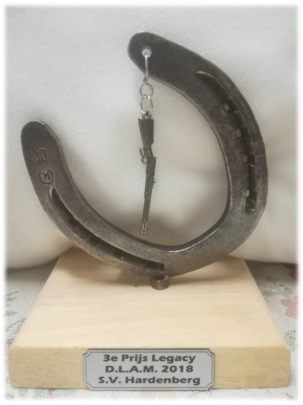 De lever action schutters die in de prijzen vielen kregen wat moois mee naar huis. De organisatie had prachtige prijzen aangemaakt. Een hoefijzer met daartussen hangend een metalen mini lever action wapen, geplaatst op een houten voet met inscriptie met daarop de mooie discipline aanduidingen Trapper en Legacy.