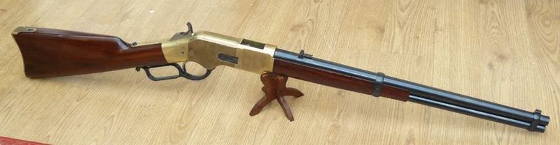 Dit wapen wil Jos op verlof hebben; een replica van het Winchester model 1866, gemaakt door de Italiaanse firma Uberti. Met een tangsight op de greep een prachtig wapen voor de zwartkruit discipline "Pope".