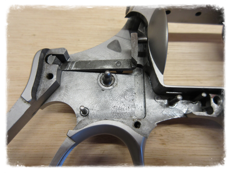 De zijplaat is eraf en er is nu goed zicht op het mechaniek van de revolver.