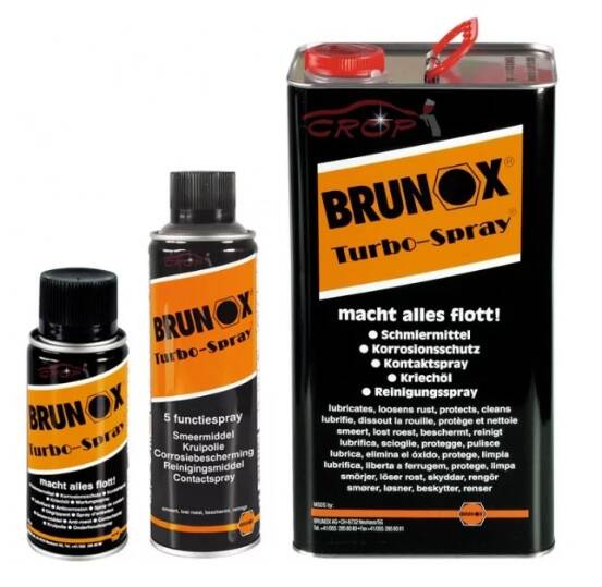 Brunox Turbo Spray spuitbussen zijn leuk maar die lekken zo nu en dan. De WLASSH geeft de voorkeur aan de grootverpakking van 5 liter met extra spuitflacon. Dat werkt beter en is nog goedkoper ook.