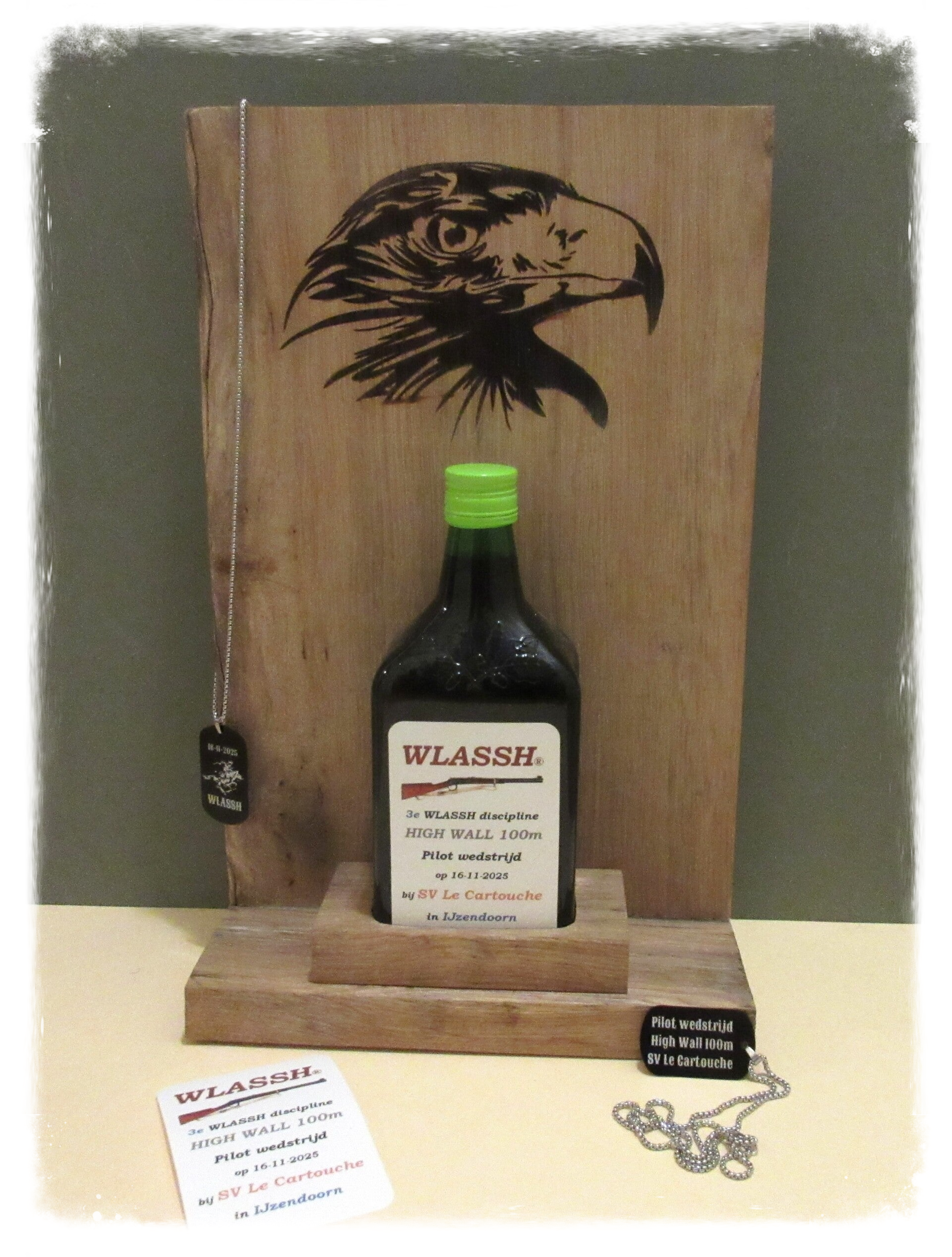 En ook de prijzen zijn dit keer afwijkend van hetgeen we gewend zijn, een eiken houder met ingebrand logo die kan staan of hangen en met daarin een speciale WLASSH kruidenbitter. Deze prijzen zijn aangemaakt en beschikbaar gesteld door WLASSH lid Roelof Schonewille. Uiteraard worden deze prijzen pas bij de volgende wedstrijd op 30 november in Bussum uitgereikt.