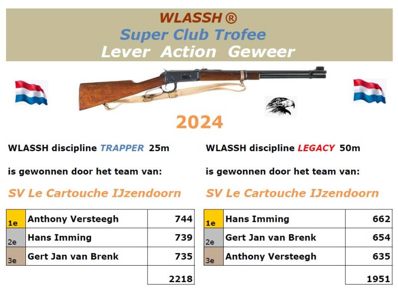 Het WLASSH bestuur feliciteert de beide teamschutters van SV Le Cartouche uit IJzendoorn met hun behaalde Super Club trofeeën. Deze beide teams van lever action schutters hebben voor hun vereniging de hoogste eindscore behaald per afstand.